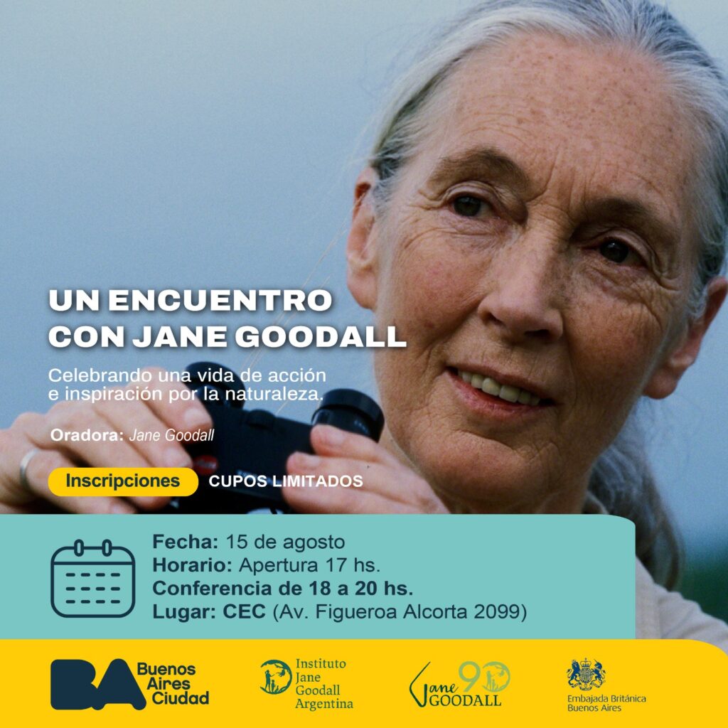 El jueves 15 de agosto la Embajada Británica invita a participar de un encuentro con Jane Goodall de manera presencial. Inscribite aquí