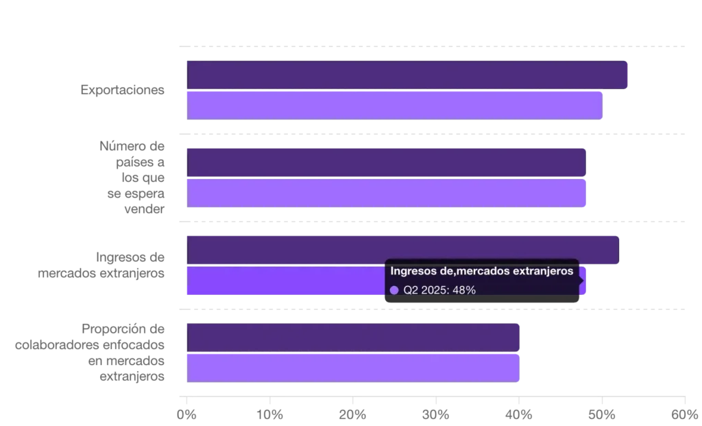 Sin embargo, el porcentaje de empresas que planea ampliar el número de países a los que venden se mantuvo sin cambios en el 48%, al igual que el porcentaje de empresas que prevén aumentar el número de empleados dedicados a los mercados internacionales, que se mantuvo estable en el 40%.
