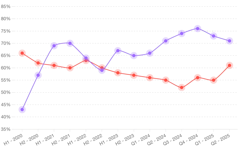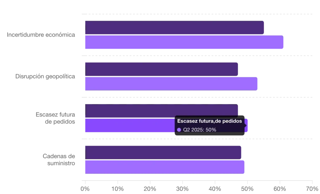 Si bien la pausa de 90 días en la mayoría de los aranceles estadounidenses se ha extendido hasta el 8 de julio y luego al 1 de agosto, la amenaza persiste, incrementando la sensación de inquietud en el mercado medio, con las preocupaciones por perturbaciones geopolíticas aumentando seis puntos porcentuales (pp) hasta el 53%, un nuevo máximo. Las preocupaciones de los líderes empresariales sobre las cadenas de suministro también alcanzaron un máximo histórico del 49% (+1pp). La preocupación por una futura escasez de pedidos también alcanzó un máximo del 50% (+3pp).