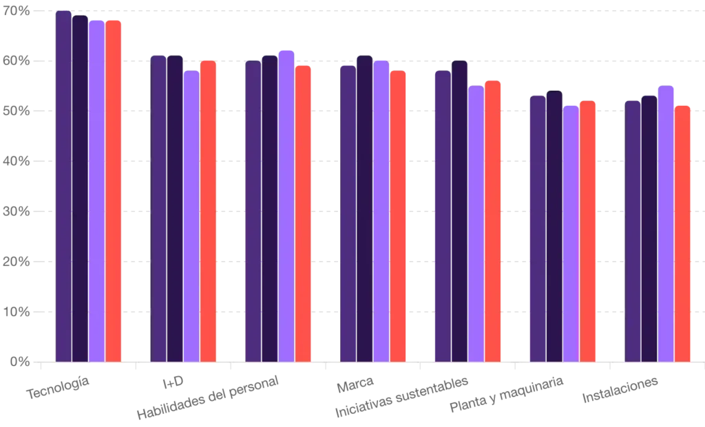Esta tendencia se destaca aún más en el último IBR por un aumento de dos puntos en la inversión en investigación y desarrollo -hasta el 60%- y un aumento de un punto hasta el 52% en la inversión en plantas y maquinaria; frente a una fuerte caída de cuatro puntos (hasta el 51%) en la inversión en espacios de trabajo.