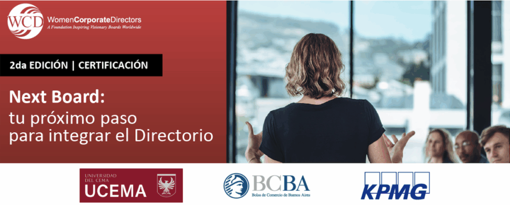 Next Board: tu próximo paso para integrar un Directorio” organizado por Women Corporate Directors – Capítulo Argentina (WCD), la Universidad del CEMA (UCEMA), la Bolsa de Comercio de Buenos Aires (BCBA) y KPMG Argentina. El objetivo de esta capacitación es preparar a los futuros Directores de empresas con un dinámico programa de contenidos actuales y las experiencias de líderes internacionales. Para realizar esta capacitación es necesario ser C-Level de una corporación, Director/a ejecutivo/a, dueño/a de empresa, Director/a de entidades sin fines de lucro, y/o Director/a de entidades gremiales empresariales.